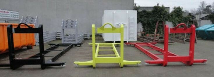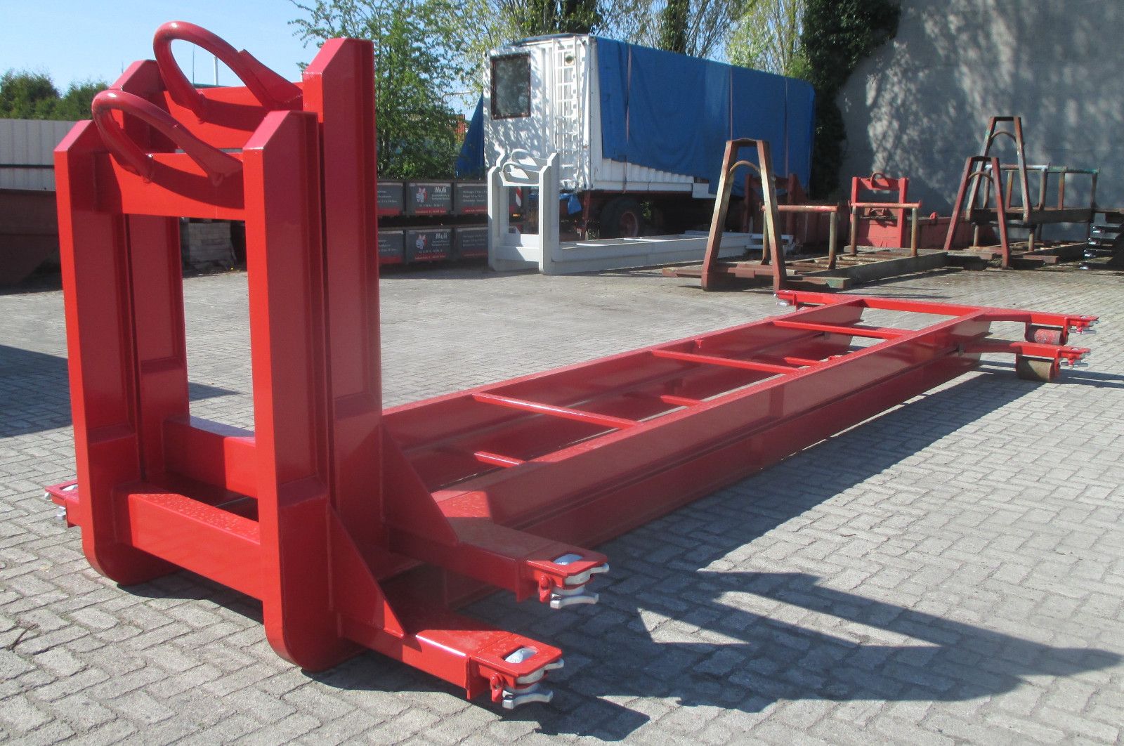 LAGERWARE - SOFORT VERFÜGBAR ELLERMANN Unterrahmen U 09/s Sonderanfertigung mit Twist-Lock Verschlüssen für 20´ Überseecontainer • Aufnahmebeschläge für Hakensysteme nach DIN 30722-1 mit heckseitigen Außenrollen und Unterrahmen aus INP 180 • Außenrollen abschmier- und wechselbar • Aufnahmebügel Ø 50 mm, Hakenhöhe 1.570 mm • 4 Stück Twist-Lock Verschlüsse für 20“ Überseecontainer nach DIN 15190 • Unterrahmen doppelt grundiert und einfarbig lackiert Folgende Farben am Lager: RAL 9005 Tiefschwarz.