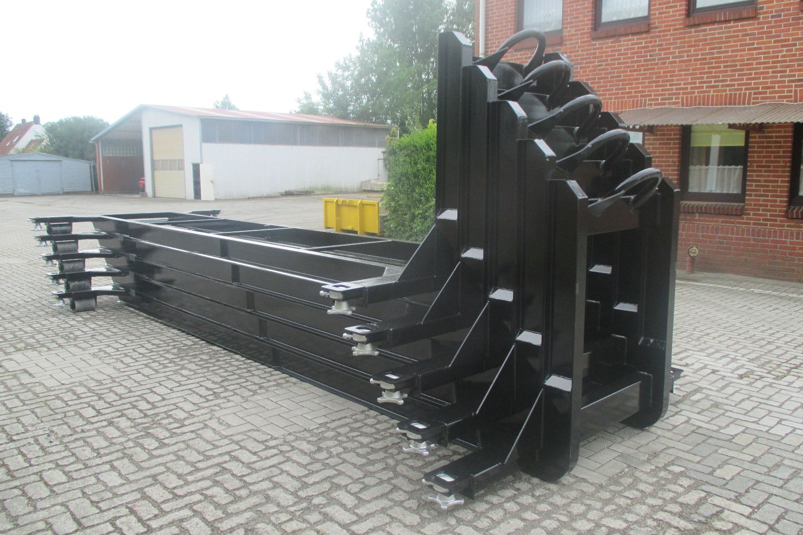 LAGERWARE - SOFORT VERFÜGBAR ELLERMANN Unterrahmen U 09/s Sonderanfertigung mit Twist-Lock Verschlüssen für 20´ Überseecontainer • Aufnahmebeschläge für Hakensysteme nach DIN 30722-1 mit heckseitigen Außenrollen und Unterrahmen aus INP 180 • Außenrollen abschmier- und wechselbar • Aufnahmebügel Ø 50 mm, Hakenhöhe 1.570 mm • 4 Stück Twist-Lock Verschlüsse für 20“ Überseecontainer nach DIN 15190 • Unterrahmen doppelt grundiert und einfarbig lackiert Folgende Farben am Lager: RAL 9005 Tiefschwarz.