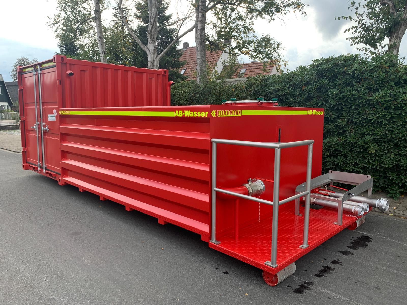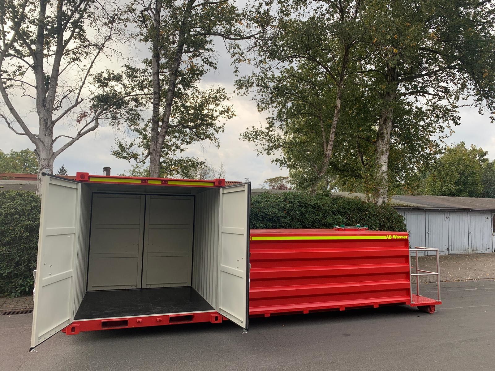 LAGERWARE - SOFORT VERFÜGBAR 1 Stück Abrollbehälter Wasser Innenlänge: ca. 6,5 Meter Inhalt 13.000 Liter ▪ Tank aus 3mm VA ▪ gekantete Seitenwände für hohe Stabilität ▪ 2 Stück Schwallwände ▪ Mannloch 600mm ▪ 2 Stück 3“ Belüftungsrohre ▪ geräumiger Geräteraum in Form eines 8´Containers ▪ Aufnahme aus VA für TS ▪ Arbeitsplattform mit Geländer aus VA ▪ UVV-Aufkleber mit Sicherheitshinweisen ▪ Behälter geprüft und abgenommen nach DGUV Regel 114-010 (ehemals BGR 186)
