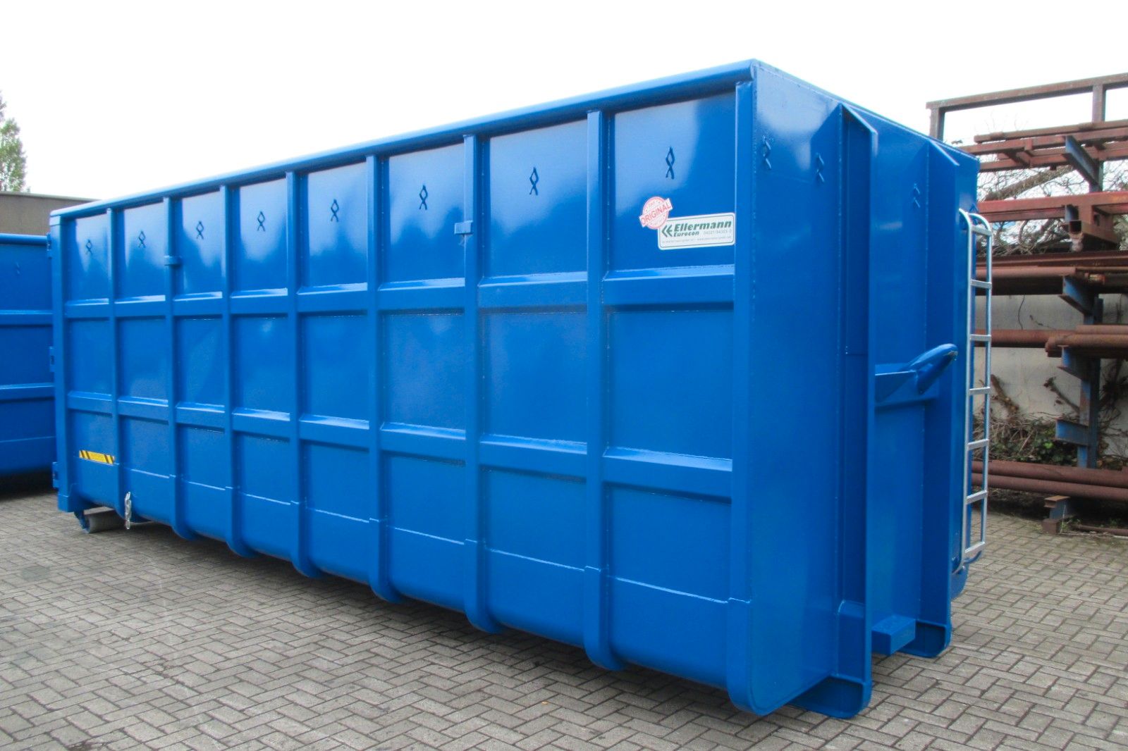 LAGERWARE - SOFORT VERFÜGBAR ELLERMANN Normbehälter Typ S 88 s (offene Ausführung) Innenmaße: 6,5 x 2,3 x 2,4 m, alle Maße sind ca. Maße Nutzinhalt: ca. 36 m³ • Aufnahmebeschläge für Hakensysteme nach DIN 30722-1 mit heckseitigen Außenrollen und Unterrahmen aus INP 180 • Außenrollen abschmier- und wechselbar • Aufnahmebügel Ø 50 mm , Hakenhöhe 1.570 mm • Bodenwanne aus 5 mm St 37.2 (S235JR) • Seitenwände aus 3 mm St 37.2 (S235JR) • Gerundete Bodenwanne, mit 250 mm Radius zur Seitenwand • Abschlussprofil aus stabilem Rundrohr Ø 90 mm • Spantenabstand 750 mm zwei Querspanten • Doppelflügeltür am Heck mit holländischem Türverschluss und seitlichem Sicherheitszentralverschluss (ZV) nach UVV • Sicherheitszentralverschluss verlängert auf 2.000 mm • Türverschluss mit Behältertür-Öffnungshilfe und Hockey-Sicherung • Zusätzlicher Öffnungs-Griff am linken Türflügel • Umlaufend Plan- und Netzhaken • Steigleiter nach UVV stirnseitig in Fahrtrichtung links (Fahrerseite) • Behälter von innen einmal grundiert, von außen doppelt grundiert und von außen doppelt einfarbig lackiert • UVV-Aufkleber mit Sicherheitshinweisen • Behälter geprüft und abgenommen nach UVV In folgenden Farben am Lager: RAL 2011 Tieforange, RAL 5010 Enzianblau, RAL 6018 Gelbgrün und RAL 7016 Anthrazitgrau.